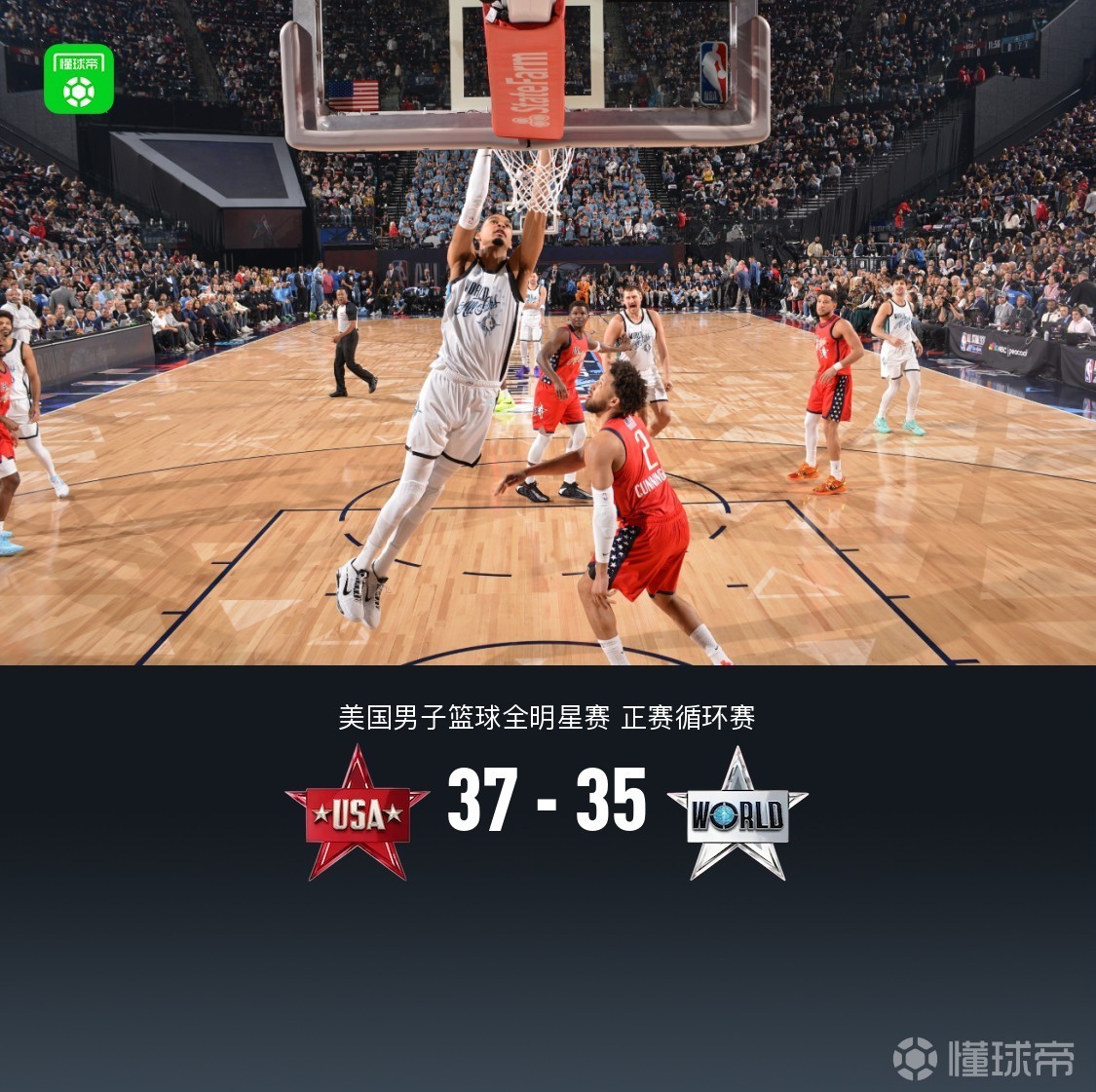 北京时间2月16日美国男子篮球全明星赛 正赛循环赛,美国星辰队对阵世界队。前半段双方保持拉锯紧咬比分,后段上来世界队一波14-2拉大至9分分差,随后美国星辰反扑,随着爱德华兹三分命中拖入加时,加时赛美国星辰队巴恩斯三分命中率先拿到5分完成绝杀,最终美国星辰队37-35世界队。